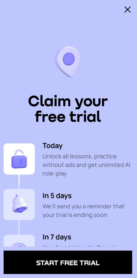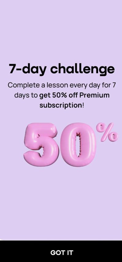 Inside the app, Promova pushes a 7-day challenge immediately after onboarding. Complete one lesson per day for 7 days and you get 50% off the premium subscription. This is not just a retention hook. It’s a conversion mechanism. They’re using engagement to earn the right to ask for money again, and making daily completion the trigger.