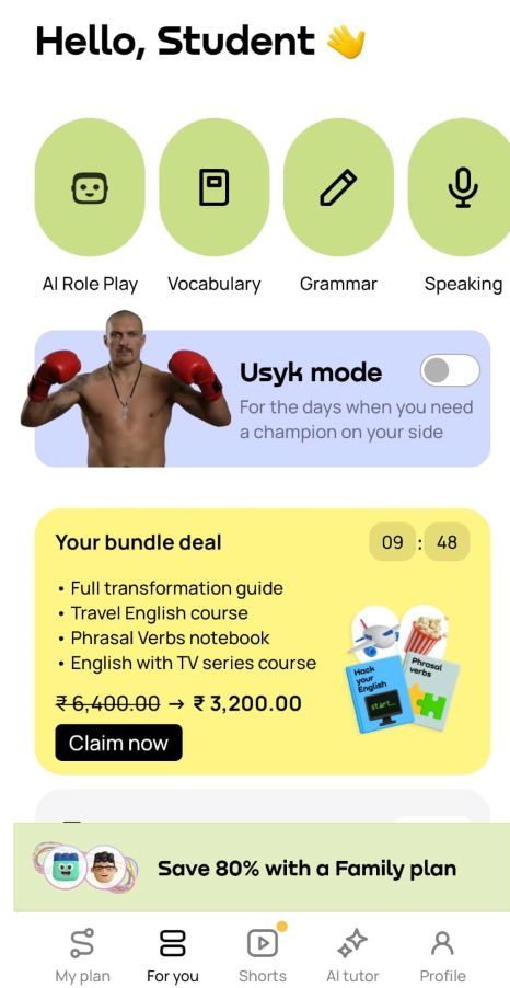 That man is Oleksandr Usyk, the world heavyweight boxing champion, who serves as Promova’s brand ambassador and the face of their “Usyk AI Tutor” feature. They’ve licensed a celebrity who is recognizable across multiple countries, made him the app icon, named a feature after him, and built a toggle inside the app called “Usyk mode” with the description: “For the days when you need a champion on your side.” Most apps use stock photography. Promova put a world champion on their home screen.