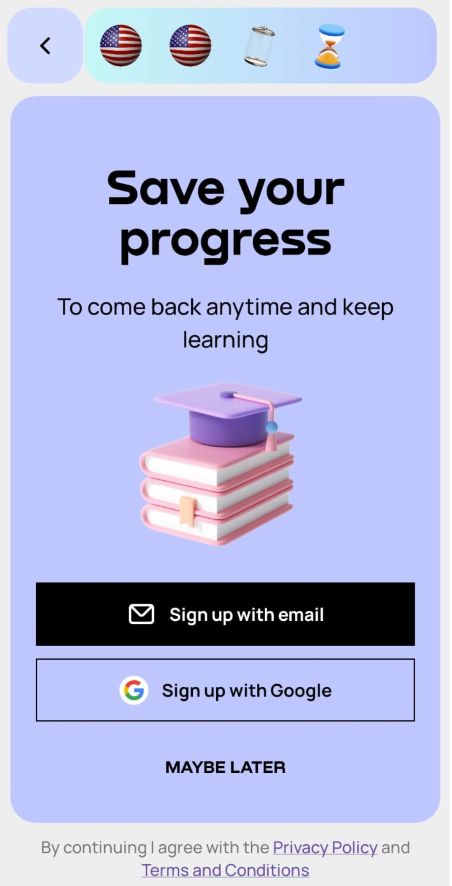 When it’s time to sign up, the prompt reads “Save your progress” rather than “Create account.”