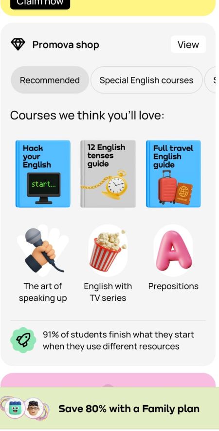 Inside the app, monetization goes well beyond the subscription. There’s a full Promova shop with individual courses: Hack your English, 12 English tenses guide, Full travel English guide, The art of speaking up, English with TV series, Prepositions. There’s a bundle deal at 50% off.