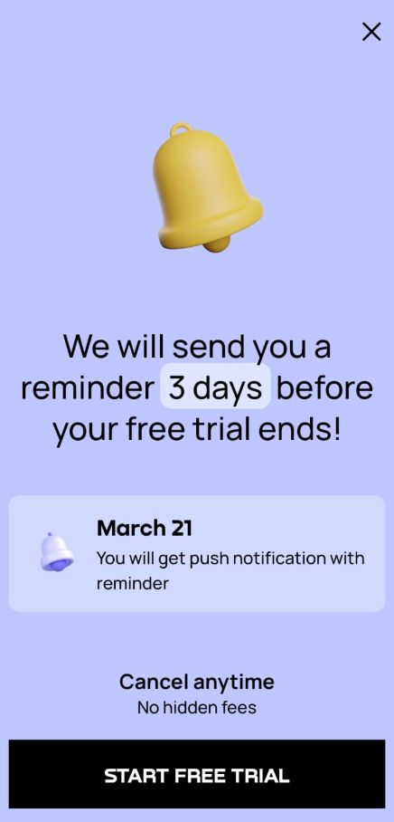 The paywall opens with “Claim your FREE 7-day trial” and the reassurance: “We’ll remind you before payment.” Every piece of copy is designed to lower perceived risk. The trial timeline is explicit: today you unlock everything, in 5 days you get a reminder, in 7 days the subscription starts. Cancel anytime. No hidden fees.