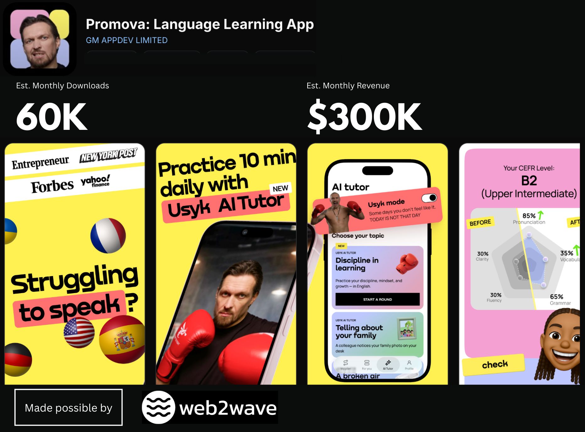 $300,000 in monthly revenue. 60,000 downloads per month. Six years old. Promova is a language learning app that does almost everything differently from its category competitors, and the differences are worth studying closely.