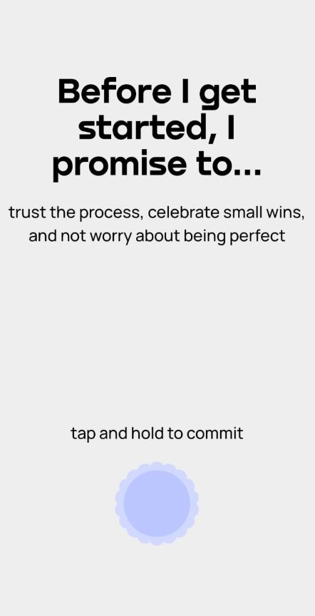 The language reframes a friction point as a benefit. Then comes the commitment screen: “Before I get started, I promise to… trust the process, celebrate small wins, and not worry about being perfect.” The user has to tap and hold a button to commit. Physical action creates psychological investment. Tiny moves. Big impact on drop-off.